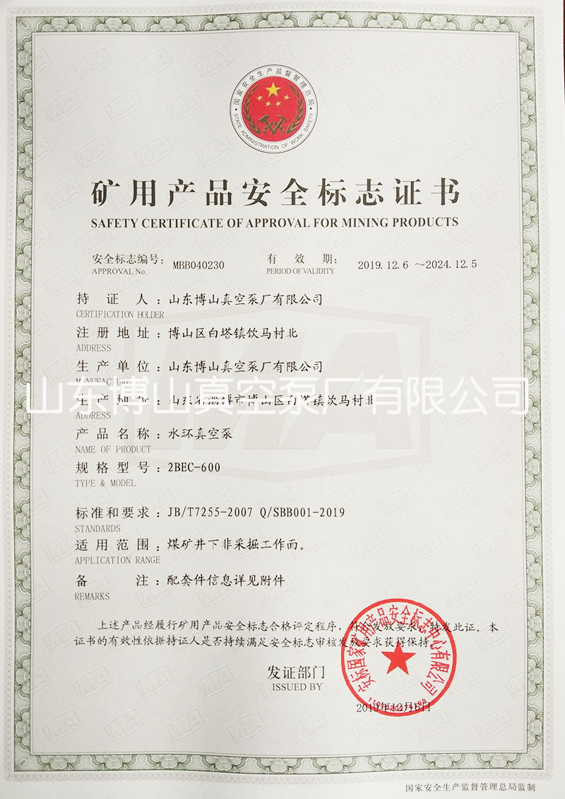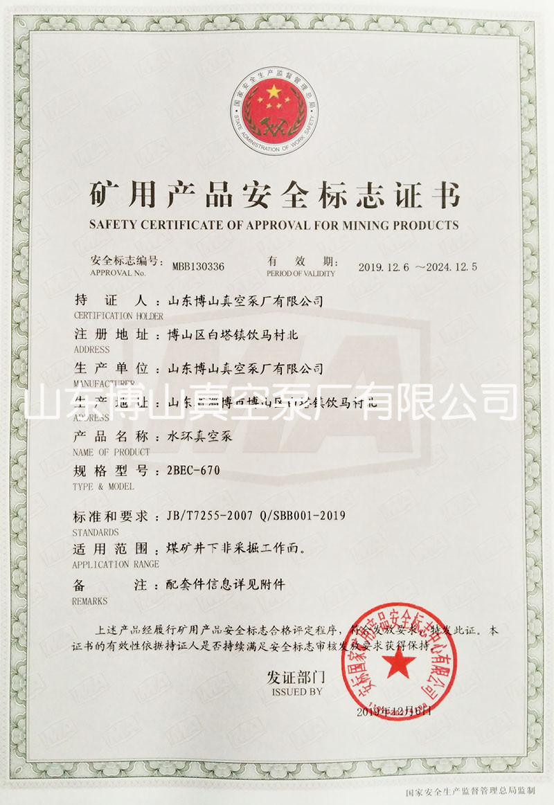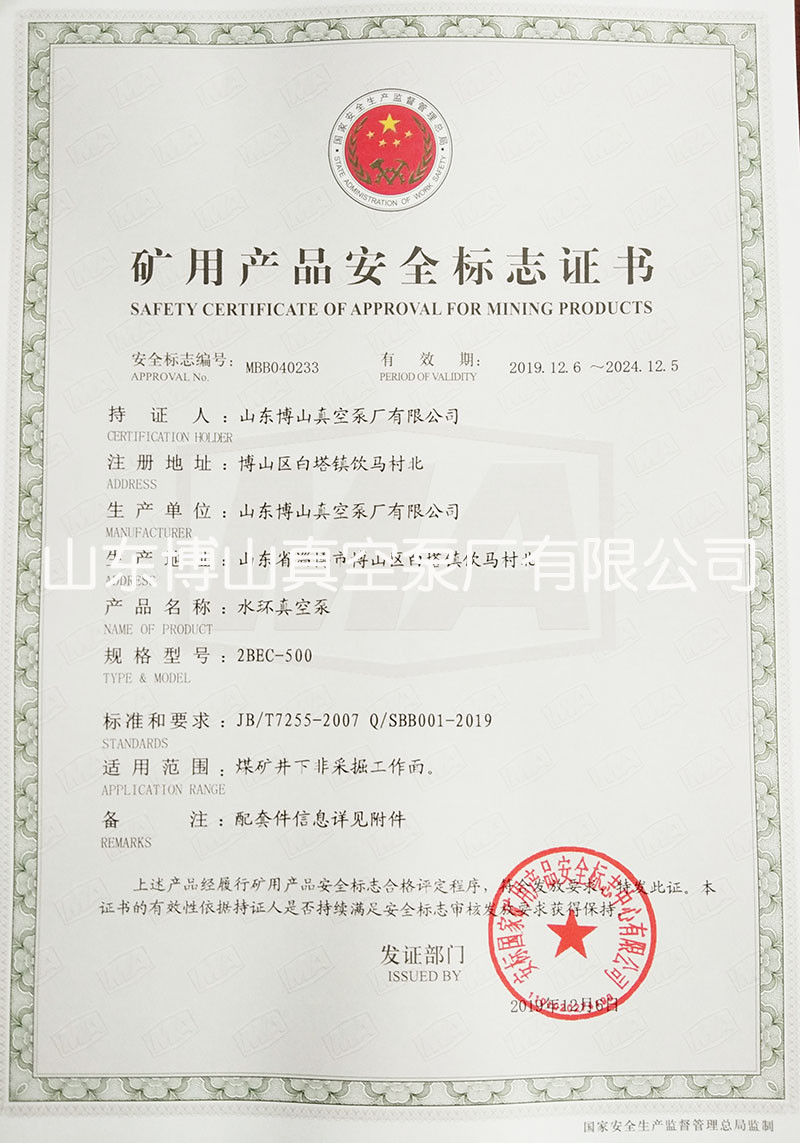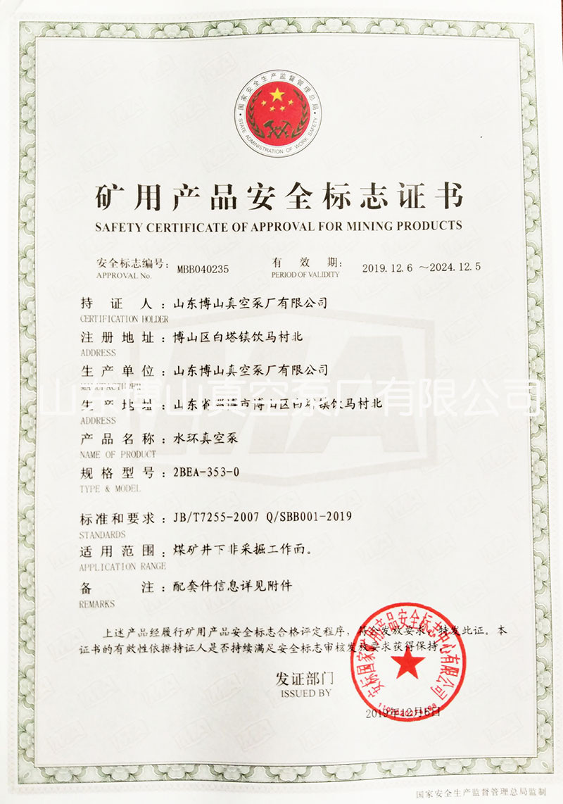 水环真空泵获得矿用产品安全标志证书详情