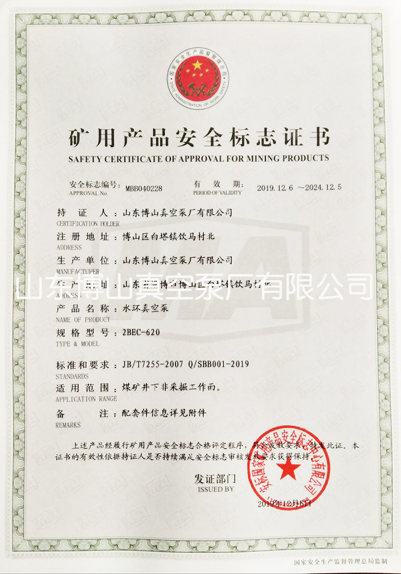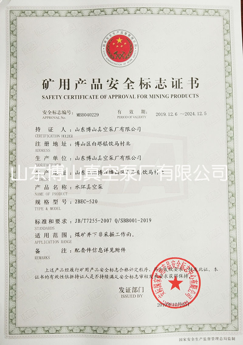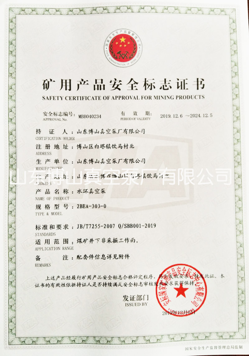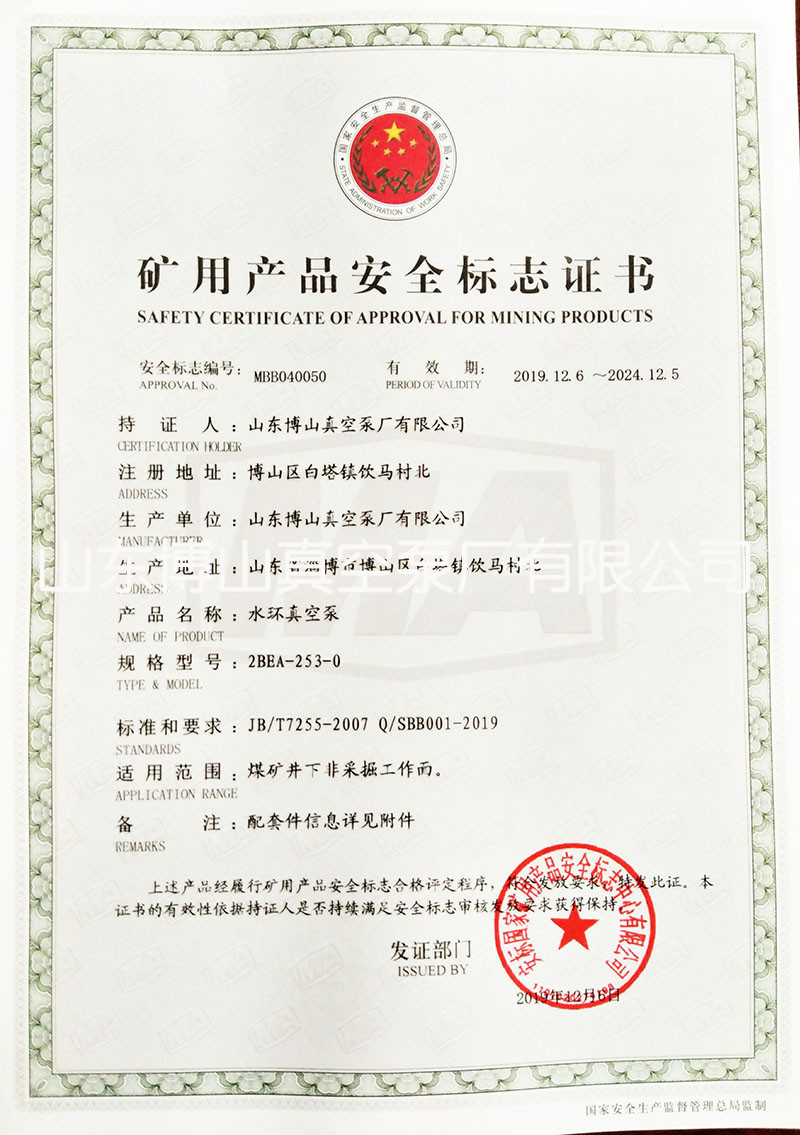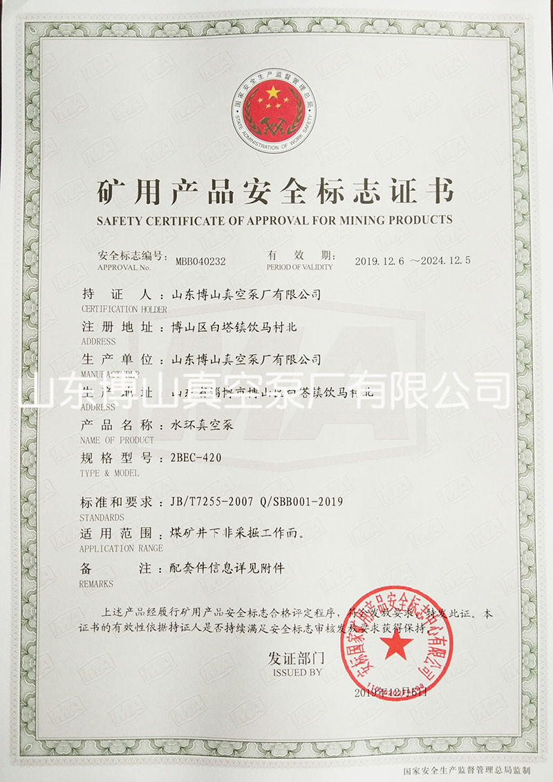 水环真空泵获得矿用产品安全标志证书详情